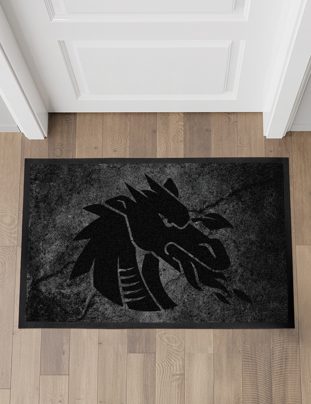 TTH dørmåtte med et stiliseret dragehoved i et råt og grafisk udtryk. Designet er mere nedtonet og stemningsfuldt, men stadig tydeligt forankret i klubbens visuelle identitet. En dørmåtte, der kombinerer karakter, enkelthed og tydelig TTH-ånd.
